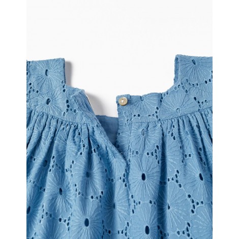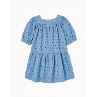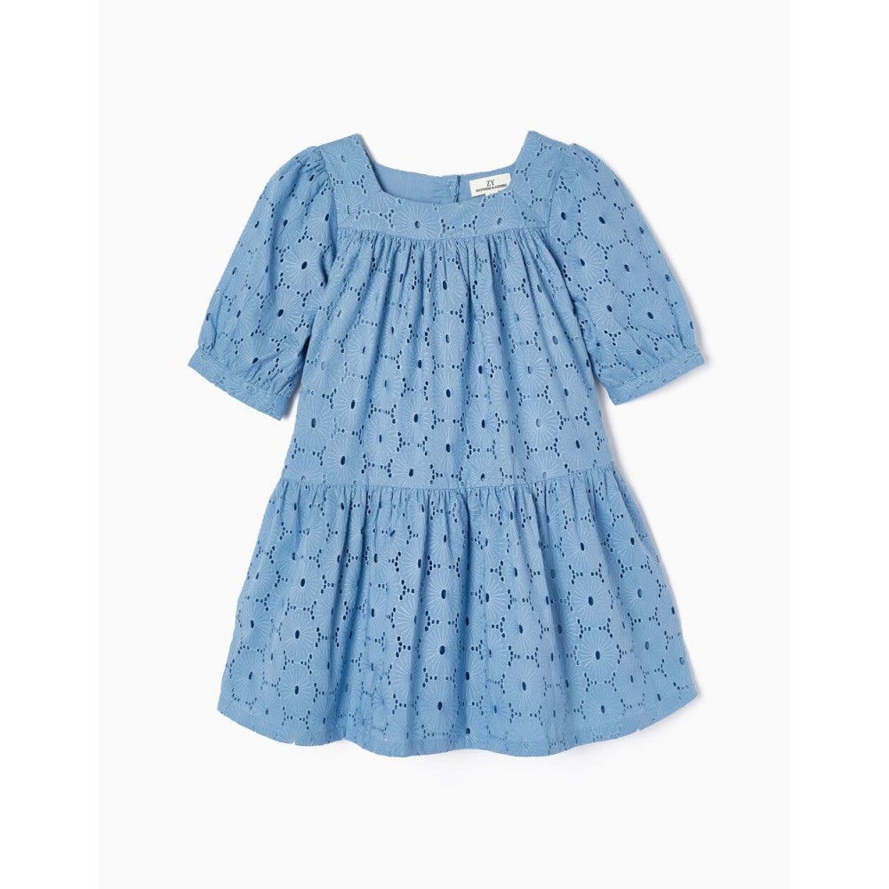 Abito blu per bambina, 100% cotone. Ricamo inglese con motivo floreale. Maniche leggermente a sbuffo con bottone sul polsino. Chiusura con bottoni sul retro per vestirsi facilmente. Taglio svasato. Un abito di mezza stagione divertente ed essenziale.
