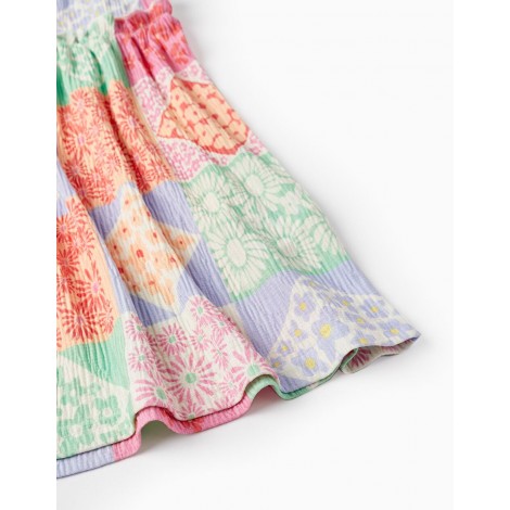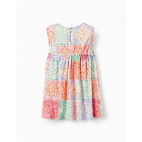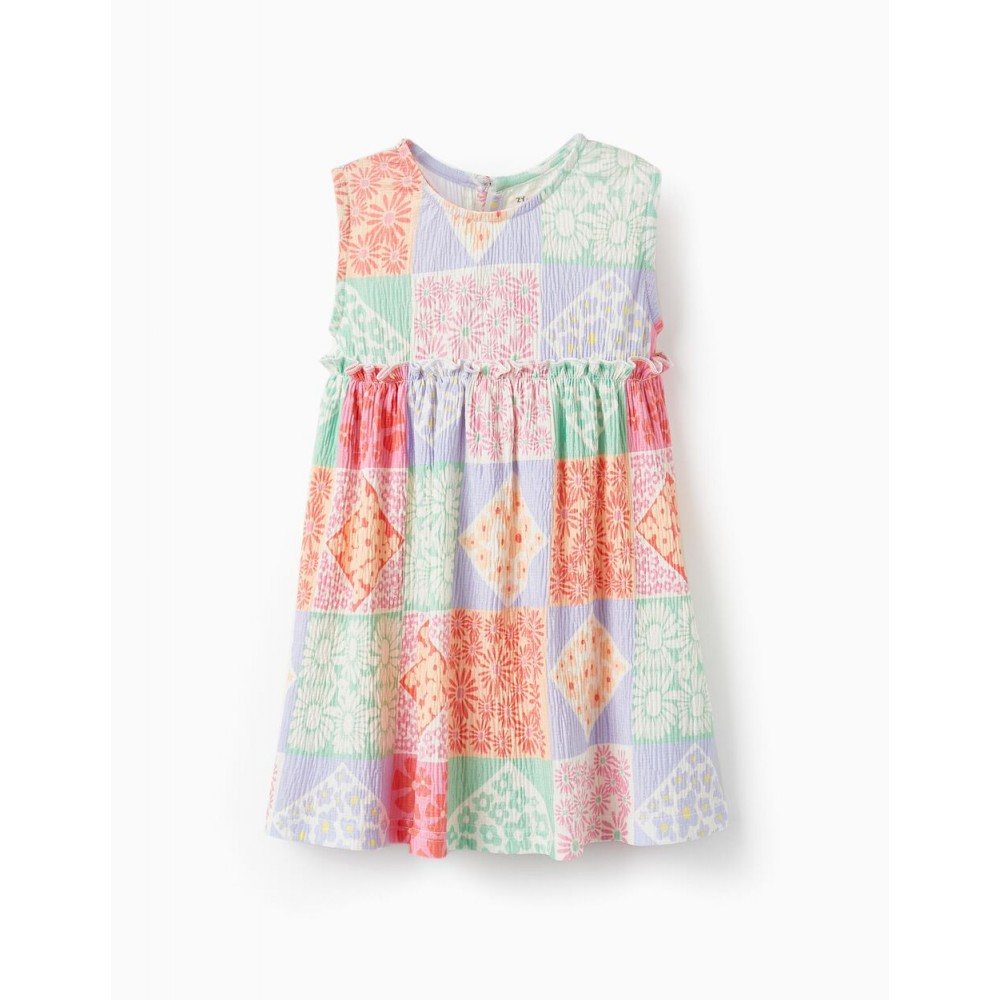 Abito smanicato per neonata, materiale con un tocco di elasticità per un maggiore comfort. Motivo floreale multicolore. Vita con volant. Un abito leggero con materiale leggermente a coste, perfetto per le giornate più calde. Un capo della collezione Mix & Match, pensato per facilitare l'abbinamento di più pezzi per look pratici, comodi e divertenti.