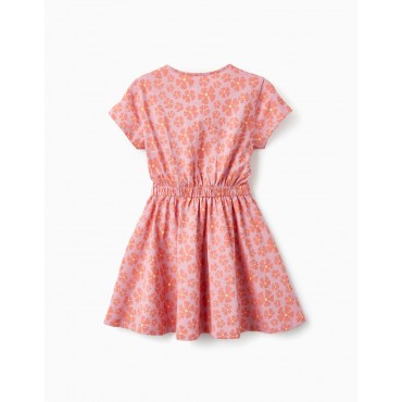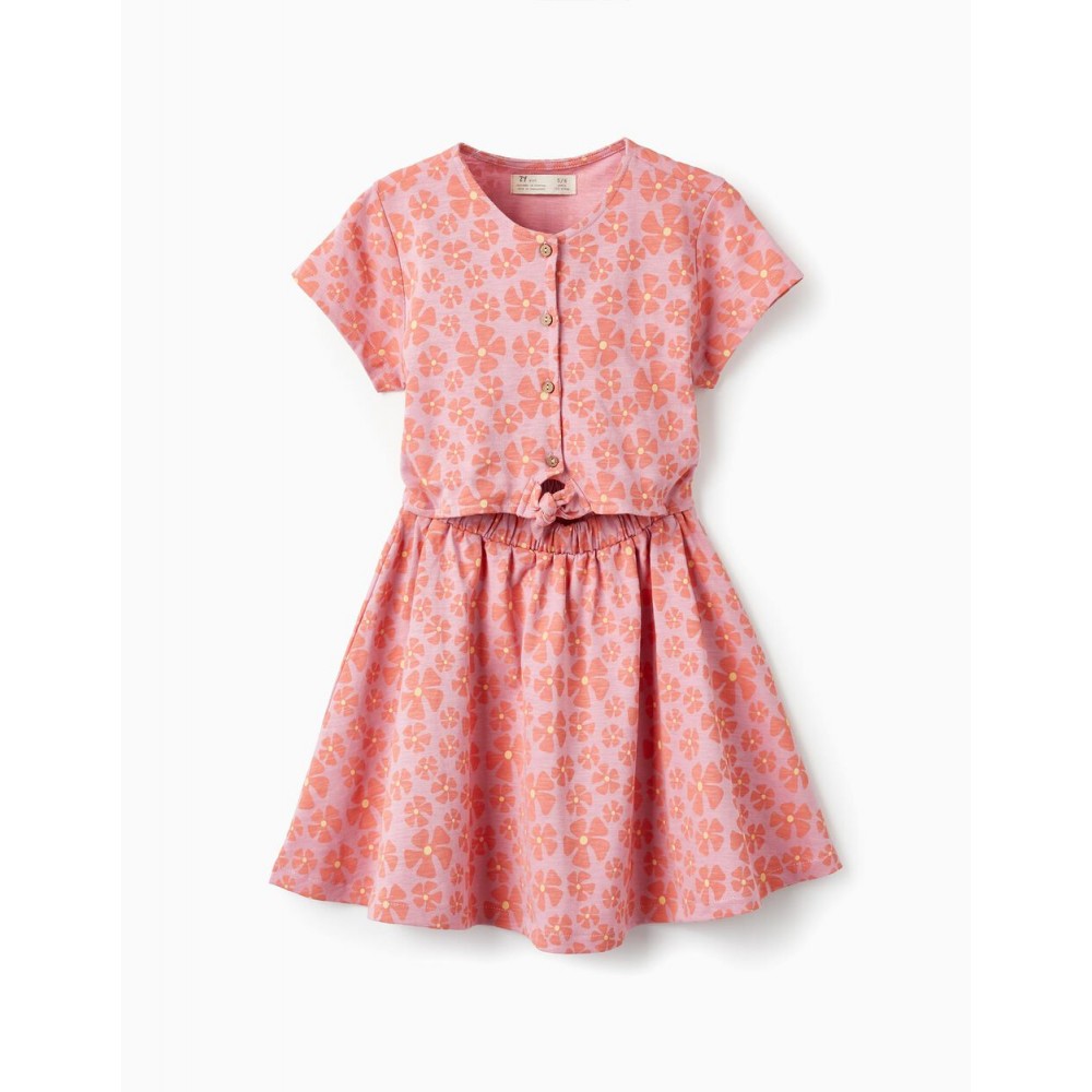 Abito rosa a maniche corte con fantasia floreale per bambina, 100% cotone. Parte superiore con effetto t-shirt e nodo alla base, in stile cropped, e parte inferiore in stile gonna con elastico in vita per una migliore vestibilità. Un abito leggero, comodo, pratico e delizioso, perfetto per le giornate calde! We Care: articolo con certificazione Oeko-Tex Standard 100, che garantisce l'assenza di sostanze nocive o irritanti per la pelle. Un'opzione leggera, trendy e confortevole.