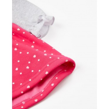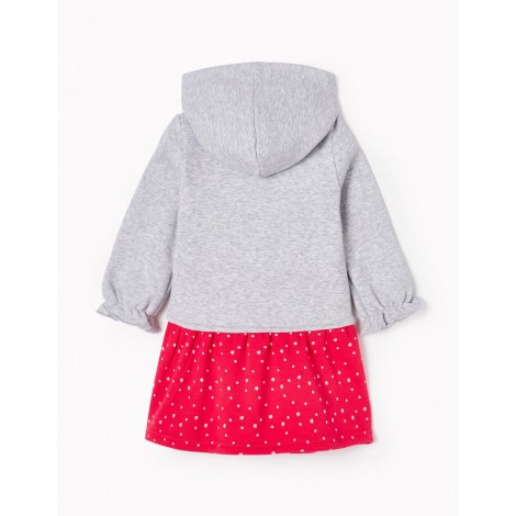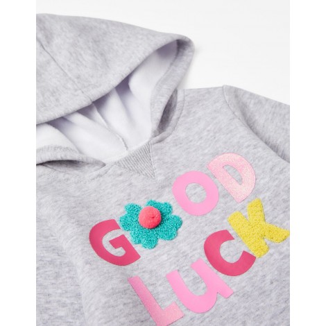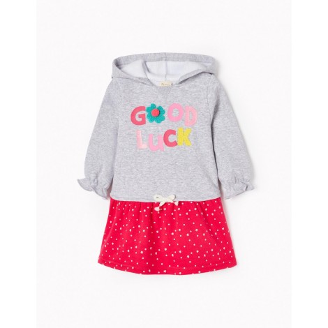 Abito felpato per neonata, garzato con morbidissimo peluche ad effetto termico. Con cappuccio. Colletto con dettaglio scollo a V a costine per una facile vestizione. Top grigio con stampa frontale, dettagli glitter e bouclé. Gonna rosa con fantasia stampata, fiocco decorativo al centro ed effetto mosso. Un abito invernale casual e originale con un positivo messaggio di buona fortuna.