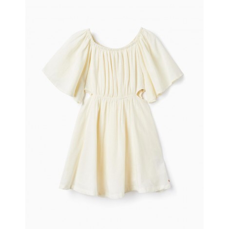 Abito bianco per bambina, realizzato in misto viscosa, cotone e lino. Fodera interna bianca in cotone 100% per un maggiore comfort. Colletto elastico aperto che si collega alle maniche per creare un effetto spalle scoperte. Maniche ampie per un look più fluido. Vita elastica con piccole aperture laterali.