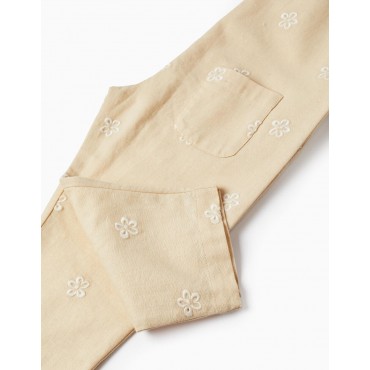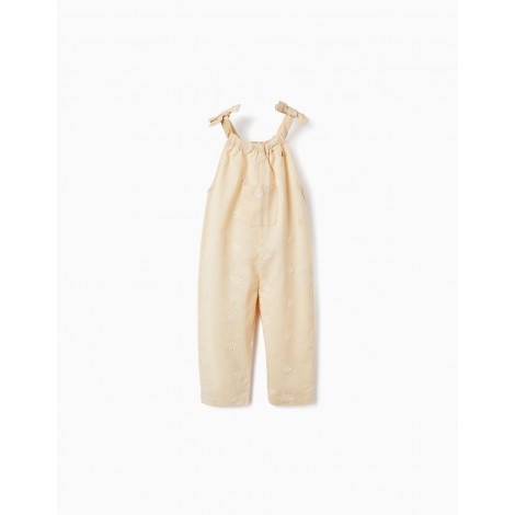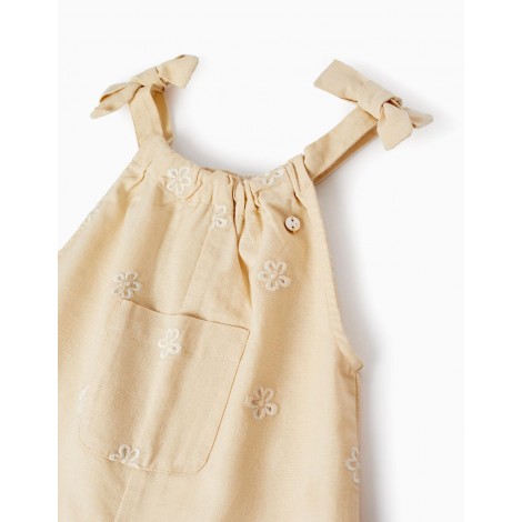 Tutina beige con motivo floreale bianco ricamato per neonata. Materiale in cotone con un tocco di lino per un maggiore comfort. Dettagli fiocco sulle spalline. Colletto elastico per una migliore vestibilità. Si chiude dietro con tre bottoni per indossarlo facilmente. Una tasca sul petto e due tasche posteriori.
