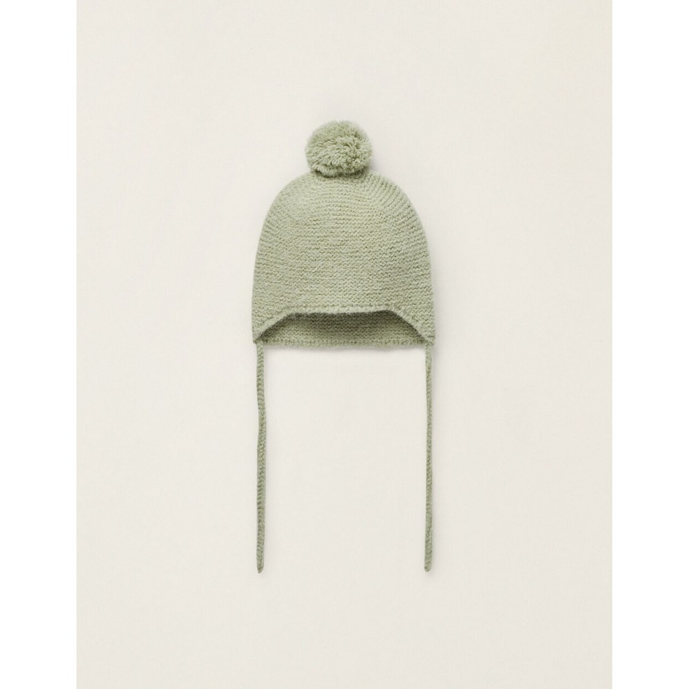 Berretto lavorato a maglia verde chiaro per neonati, con un pompon decorativo sulla parte superiore. Si chiude con cinghie laterali per una vestibilità perfetta. Un accessorio caldo per le giornate fredde.
