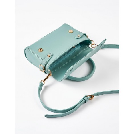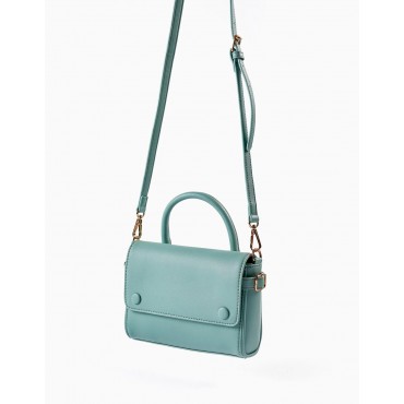 Borsa a tracolla per bambina verde acqua, realizzata in pelle sintetica. Si chiude con bottoni magnetici dorati sotto bottoni decorativi. Tracolla regolabile e removibile. Con fodera. Tasca interna con chiusura con cerniera dorata. Un capo per completare il look dei più piccoli.
