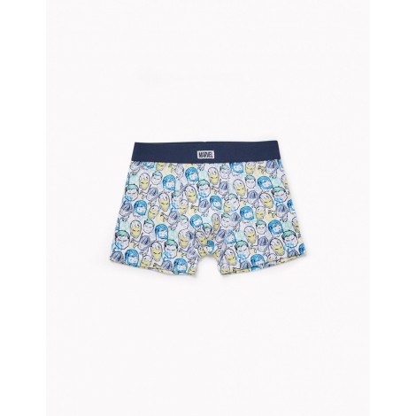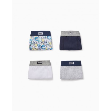Confezione da quattro boxer Marvel da bambino, in cotone ed elastan per un maggiore comfort. Include boxer bianchi, blu scuro e grigi, con stampe dei Vendicatori tra cui Hulk, Iron Man, Capitan America e Spider-Man. Cintura elasticizzata. Custodia inclusa. Intimo pratico e confortevole con i supereroi preferiti dai ragazzi.