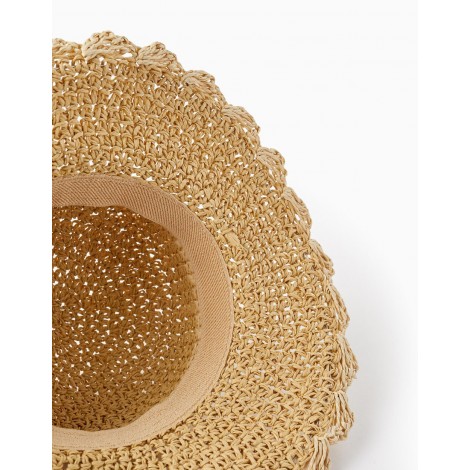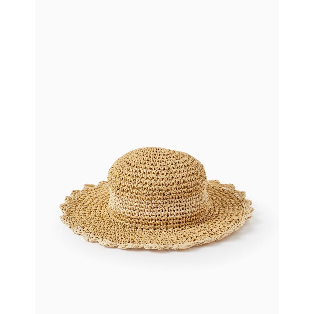 Cappello beige in stile cappello di paglia per bambina. Con elastico interno per un maggiore comfort intorno alla testa. Con filo sottile all'interno per mantenere la forma del cappello. Finitura ondulata in un tono più chiaro per un maggiore contrasto. Un cappello classico dal tocco originale. Perfetto per le giornate più soleggiate.