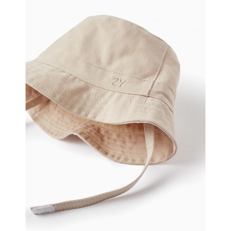 Cappello beige per neonato e bambino, in twill di cotone 100%. Fodera interna in misto poliestere e cotone. Nastri laterali con chiusura a strappo per stringere, per le taglie da 12 m a 24 m. Un accessorio indispensabile per proteggere la pelle sensibile dei bambini nelle giornate soleggiate.
