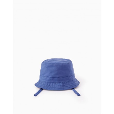 Cappello blu per neonato e bambino, in twill di cotone 100%. Fodera interna in misto poliestere e cotone. Nastri laterali con chiusura a strappo per stringere, per le taglie da 12 m a 24 m. Un accessorio indispensabile per proteggere la pelle sensibile dei bambini nelle giornate soleggiate.