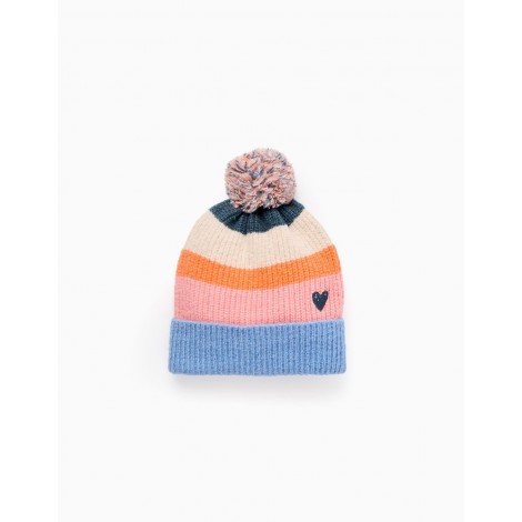 Berretto lavorato a maglia multicolore per bambine, con strisce nei toni del blu, rosa, arancione e beige. Con pompon sulla parte superiore e dettaglio a cuore ricamato. Orlo risvoltato a coste.
