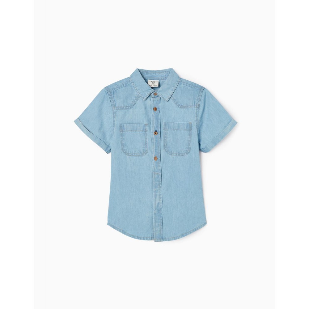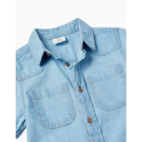 Camicia blu a maniche corte per bambino, realizzata in denim 100% cotone. Bottoni in cocco visibili in alto e nascosti in basso. Tasche sul petto. Estremità arrotondata. Una camicia comoda, versatile e senza tempo. Big Me: Bottone e asola di colore diverso, così i bambini possono identificare facilmente dove allacciarsi, favorendo la loro autonomia.