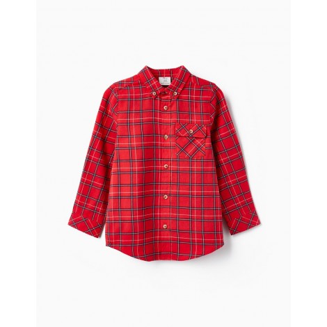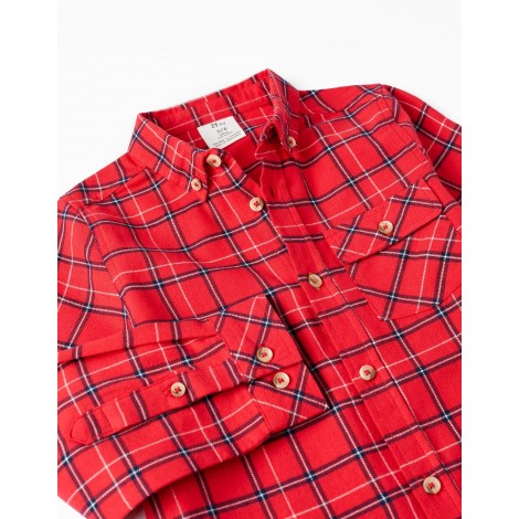Camicia rossa a maniche lunghe per bambino, 100% cotone. Con motivo a quadretti nei toni del blu scuro, rosso e bianco. Una tasca sul petto. Polsini regolabili. Big Me: asola e linea dei bottoni a contrasto in modo che il bambino possa facilmente identificare dove iniziare ad abbottonare.