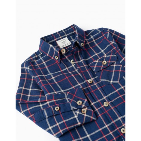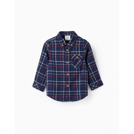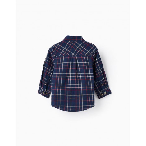 Camicia blu scuro a maniche lunghe per neonato, 100% cotone. Con motivo a quadretti nei toni del rosso e del bianco. Una tasca sul petto. Polsini regolabili e maniche ripiegabili con bottoni e passanti. Si chiude sul davanti con bottoni a pressione. Dettaglio di una piega sul retro. Una camicia accogliente e senza tempo, la scelta perfetta per l'autunno!