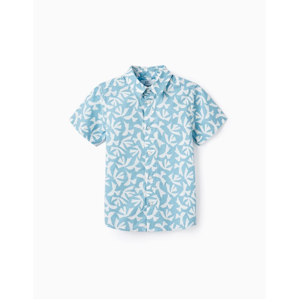 Camicia azzurra a maniche corte per bambino in 100% cotone. Modello bianco. Si chiude davanti con bottoni. Con dettagli di piega sul retro e fondo arrotondato. Una maglietta leggera e comoda. We Care: Articolo con certificazione Oeko-Tex Standard 100, che garantisce l'assenza di sostanze nocive o irritanti per la pelle.