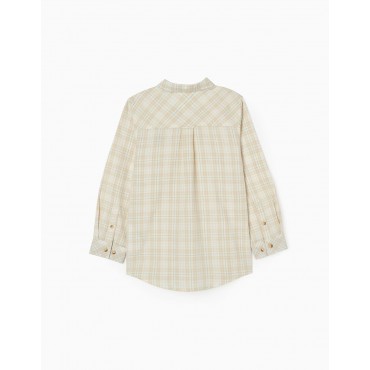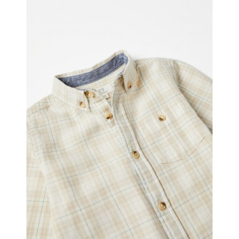 Maglia manica lunga per bambino, 100% cotone, con fantasia a quadri, nei toni del beige, bianco e verde. Una tasca sul petto. Polsini regolabili. Può essere indossata come camicia per uno stile più classico o come sovracamicia per un look più casual. Big Me: bottone e asola di colore diverso, così i bambini possono facilmente identificare dove allacciare, favorendo la loro autonomia