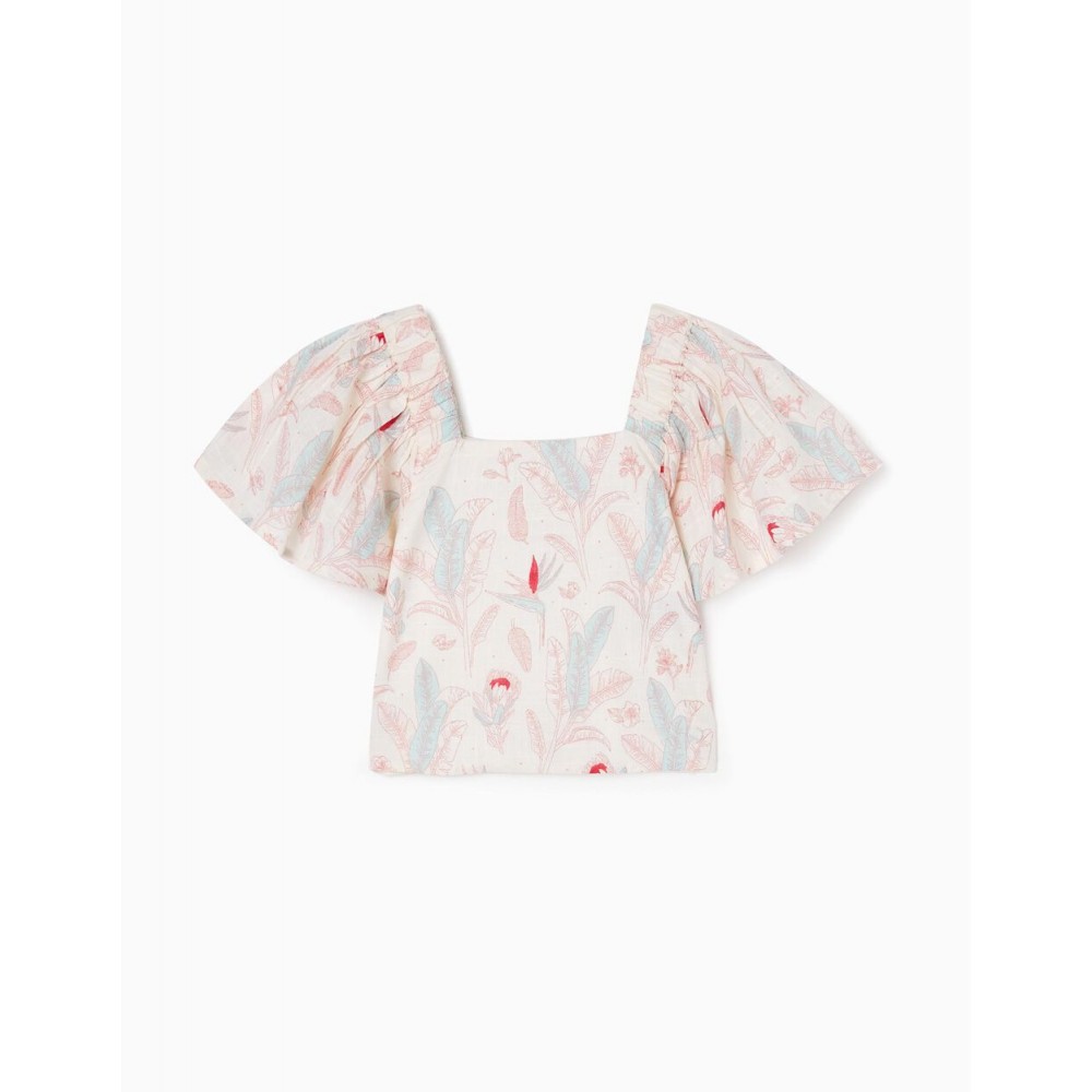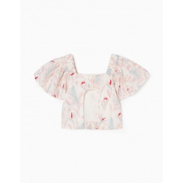 Crop top beige per bambina, realizzato in 100% cotone, con motivo a fiori e foglie in rosso e blu. Maniche ondulate ed elasticizzate. Schiena aperta con bottoni ed elastico per una vestibilità perfetta. Con fodera. Un capo comodo, leggero e adorabile, perfetto per la primavera-estate.