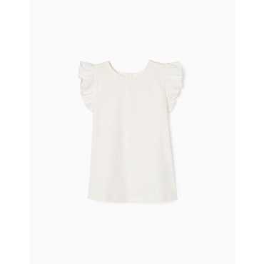 T-shirt bianca senza maniche per bambina, realizzata in jersey di cotone con un tocco di elasticità per maggiore comfort e libertà di movimento. Volant sulle spalle. Bottone sul retro per vestirsi facilmente. Etichetta interna stampata per non irritare la pelle. Vestibilità svasata. Un guardaroba basico, sta bene con tutto! We Care: Questo articolo è certificato secondo l'Oeko-Tex Standard 100, che garantisce l'assenza di sostanze nocive o irritanti per la pelle.
