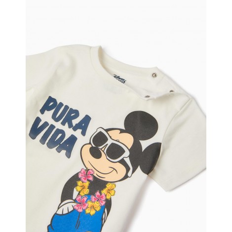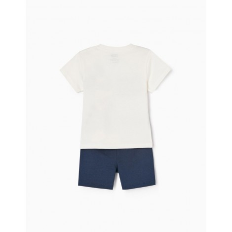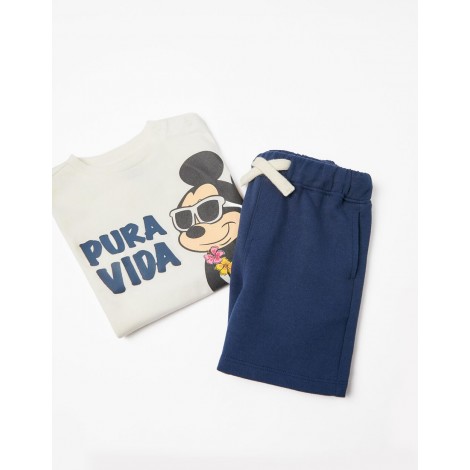 Completo due pezzi per neonato, 100% cotone. Include una t-shirt bianca a maniche corte con stampa frontale di Topolino. Con bottoni a pressione sulla spalla per vestirsi facilmente ed etichetta interna stampata per non irritare la pelle. Shorts in felpa blu scuro con elastico in vita, coulisse a contrasto e tasche laterali. Un pratico set per l'estate, da indossare insieme o separatamente.