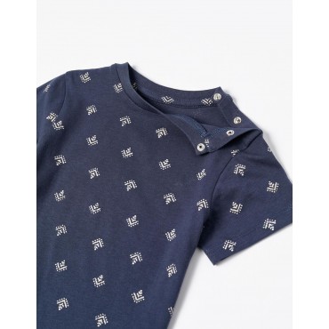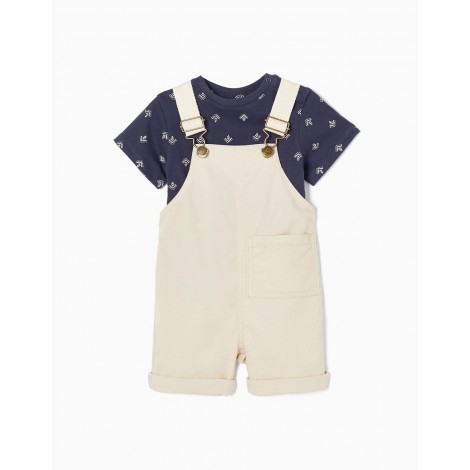 Completo due pezzi per neonato, 100% cotone. È composto da una t-shirt a maniche corte blu scuro con motivo. Con bottoni a pressione sulla spalla per vestirsi facilmente. Etichetta interna stampata per non irritare la pelle. Include anche salopette in twill beige. Cinghie regolabili. Una tasca davanti e due dietro. Cintura elasticizzata sul retro per una vestibilità perfetta. Un outfit comodo e adorabile, perfetto per ogni occasione.