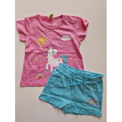 Completo neonata Losan rosa stampa unicorno, pantaloncino verde acqua con elastico in vita