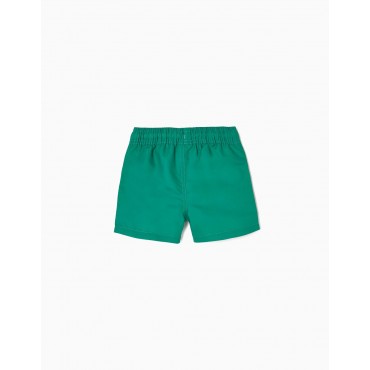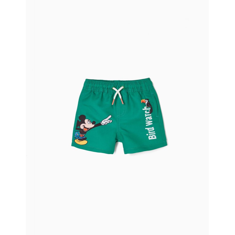 Costume da bagno verde per neonato, con stampa Topolino e tucano. Vita elasticizzata con coulisse a contrasto. Due tasche laterali e una tasca posteriore. Slip in rete integrato. Con fattore di protezione solare UV tessile conforme alla certificazione UV Standard 801, che garantisce l'efficienza del tessuto allo stato asciutto, bagnato, teso e invecchiato.