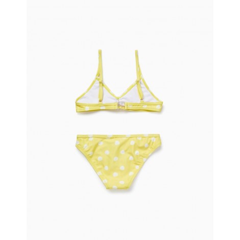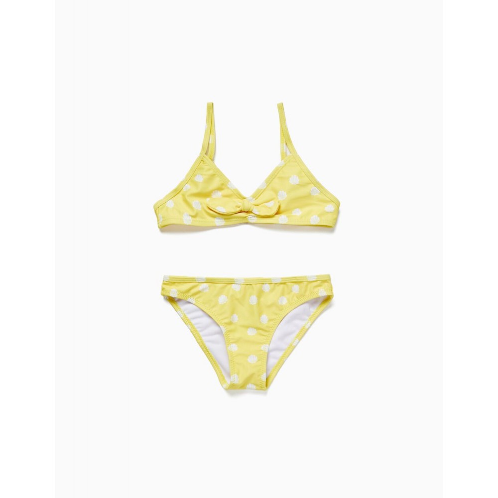 Bikini giallo due pezzi per bambina, con un tocco di elasticità per una maggiore libertà di movimento. Con fodera per un maggiore comfort. Motivo a conchiglia in contrasto. Parte superiore con coppe triangolari ed elastico al centro. Con fiocco decorativo e cerniera posteriore per vestirsi facilmente. Spalline incrociate regolabili. Pantaloni con estremità elasticizzate per una migliore vestibilità. Un pezzo divertente e adorabile per le giornate in spiaggia della bambina.