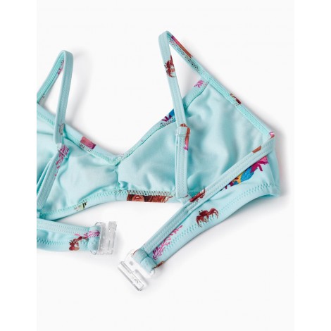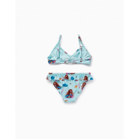 Bikini verde acqua per bambina, con fantasia Ariel. Top con spalline regolabili, fiocco decorativo e chiusura a moschettone. Slip bikini con volant in vita. Con fodera per un maggiore comfort. Il bikini perfetto per i fan della Sirenetta. We Care: Tessuto con fattore di protezione solare 80, secondo il certificato UV Standard 801, che garantisce l'efficacia del tessuto in condizioni asciutte, bagnate, distese e dopo i lavaggi.