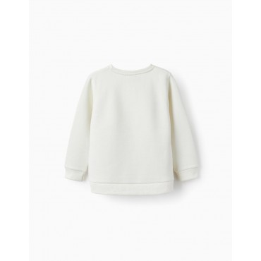 Felpa bianca per bambina, con interno felpato per un maggiore comfort termico. Stampa frontale. Polsini a costine per una migliore vestibilità. Base asimmetrica, più lunga dietro e con aperture laterali. We Care: articolo con certificazione Oeko-Tex Standard 100, che garantisce l'assenza di sostanze nocive o irritanti per la pelle. Una felpa originale e comoda da indossare tutti i giorni.