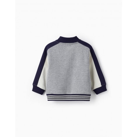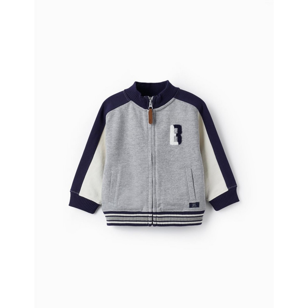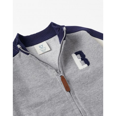 Felpa bianco, blu scuro e grigio con cerniera per ragazzi. Con dettaglio "B" in bouclé. Due tasche frontali. Chiusura con cerniera di facile apertura con dettaglio tiretto marrone. Collo, orlo e polsini a costine per una migliore vestibilità. Un cappotto elegante e pratico.