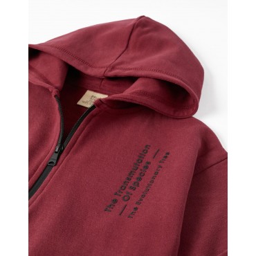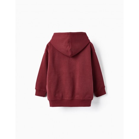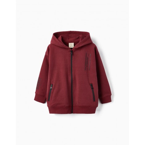 Giacca bordeaux a maniche lunghe per bambino con cappuccio, 100% cotone. Stampa frontale con testo in rilievo. Cerniera frontale nera per una facile apertura. Due tasche con apertura con cerniera a contrasto. Polsini a costine per una migliore vestibilità. Una giacca comoda e accogliente, essenziale per le giornate più fresche.
