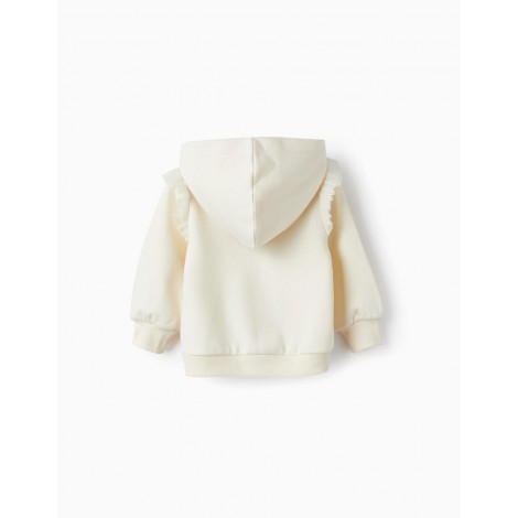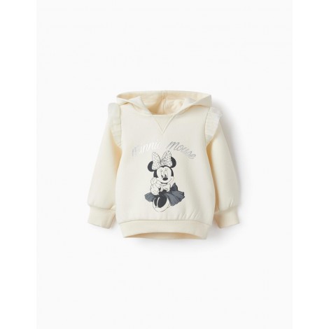 Felpa Disney color panna con cappuccio per neonata, realizzata in misto cotone. Interno spazzolato per un maggiore comfort termico. Volant in tulle sulle spalle. Stampa frontale di Minnie con dettagli argentati in rilievo sul fiocco di Minnie. Polsini e orlo a coste. Una felpa pratica e comoda da indossare quotidianamente.