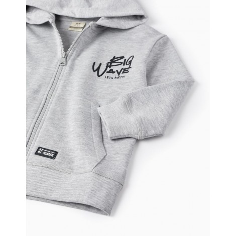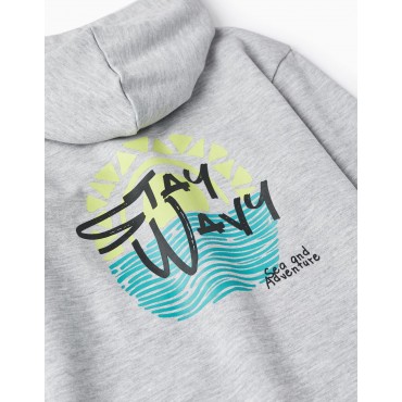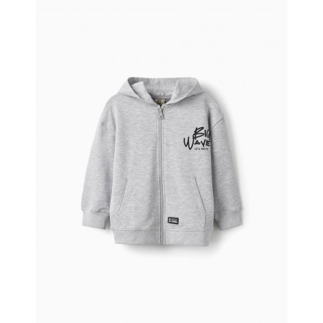 Felpa grigio chiaro con cappuccio per bambino, realizzata in cotone, con interno garzato per un maggiore comfort. Facile apertura con cerniera frontale. Dettaglio testo nero sul davanti e dettaglio illustrazione e testo sul retro in nero, turchese e verde. Piccola striscia di gomma nera con dettagli del marchio. Due tasche frontali stile canguro. Orlo e polsini a costine per una migliore vestibilità. Un capo ideale per le giornate più fresche.