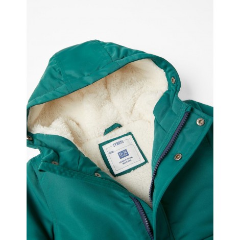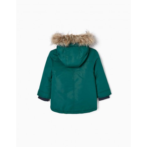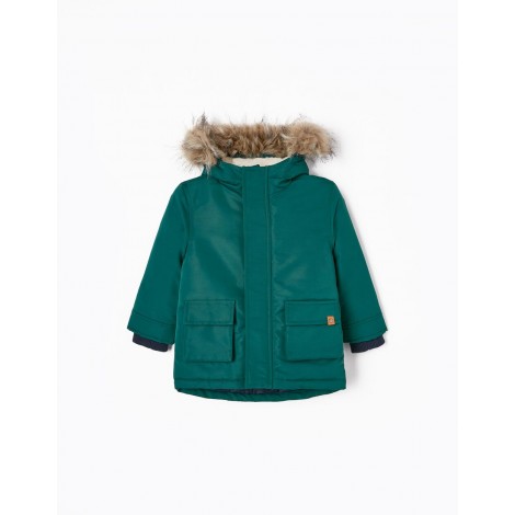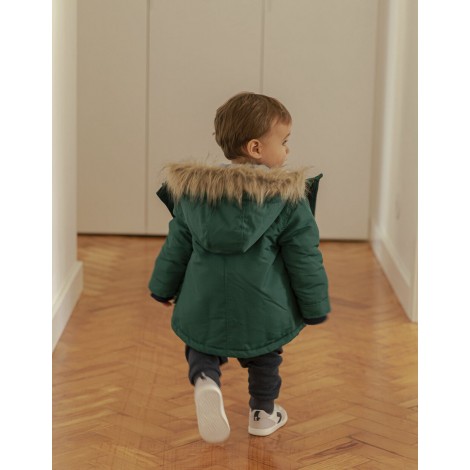 Parka verde con cappuccio e imbottitura per bambino. Fodera in sherpa per un maggiore comfort termico. Cappuccio con inserto in ecopelliccia (removibile). Polsini a costine per una vestibilità perfetta. Si chiude con zip e bottoni automatici. Due tasche laterali con patta. Con etichetta interna per l'identificazione del bambino. Una giacca calda, comoda e di lunga durata, la scelta giusta per i mesi invernali. We Care: questo capo è stato riempito con poliestere riciclato.