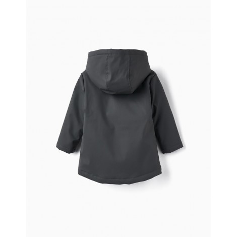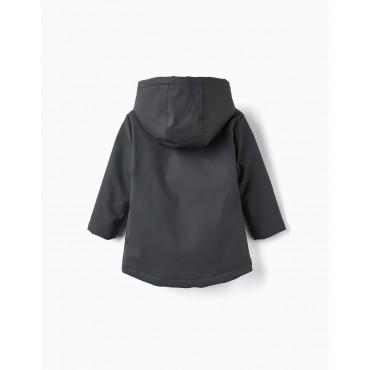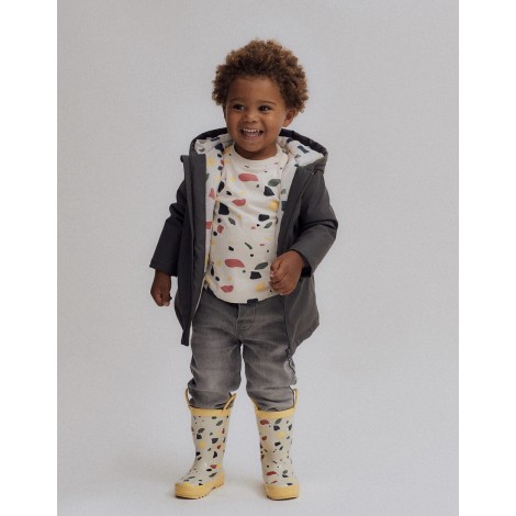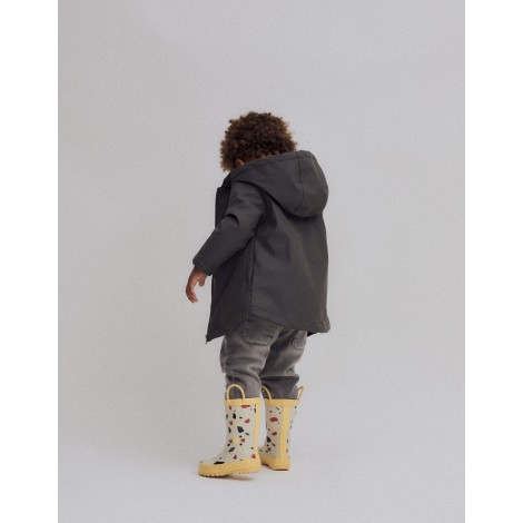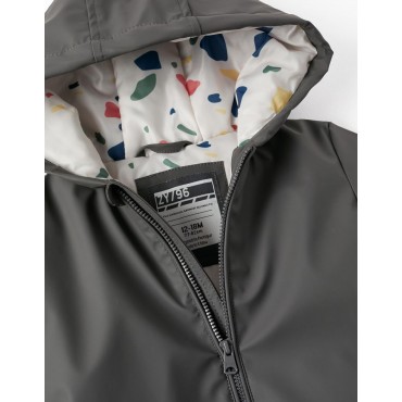 Parka in gomma grigio scuro con imbottitura e cappuccio per Neonato. Fodera fantasia multicolore. Dispone di una chiusura con cerniera per vestirsi facilmente. Tasche anteriori. Etichetta interna per l'identificazione del bambino. Un cappotto divertente e super confortevole, perfetto per le giornate più fredde e piovose. We Care: l'imbottitura di questo capo è realizzata in poliestere riciclato.