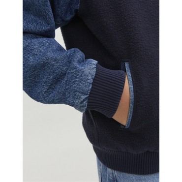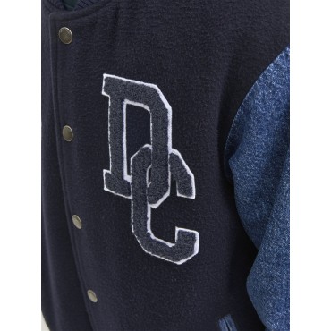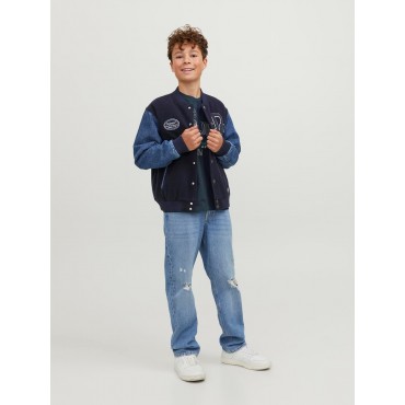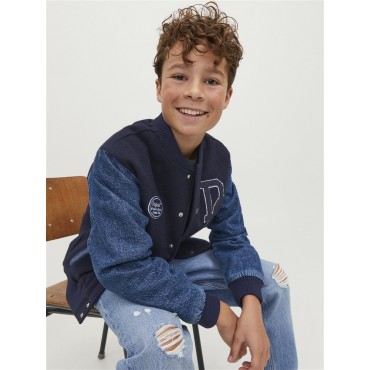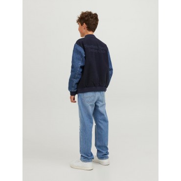 Giubbotto bambino/ragazzo Jack & Jones blu modello college, apertura con bottoni a clip, foderato all'interno, maniche in denim, collo e polsini a costine