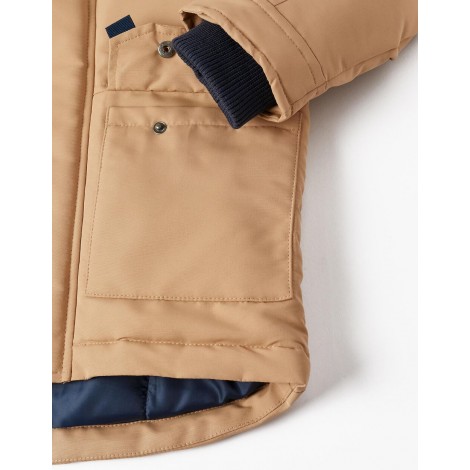 Parka beige con cappuccio per ragazzi. Cappuccio con pelliccia e foderato con materiale pile caldo e confortevole. Si chiude con una cerniera nascosta sotto una patta con bottone a pressione. Polsini interni a costine blu scuro per un maggiore comfort e una perfetta vestibilità. Tasche con patta. Etichetta interna per inserire l'identificazione del bambino. La giacca ideale per le giornate più fredde. We Care: l'imbottitura di questo capo è realizzata in poliestere riciclato.
