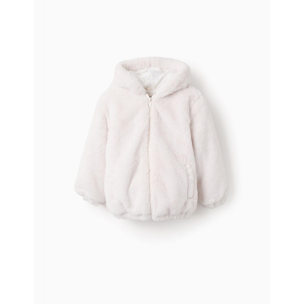 Giacca bianca in pelliccia sintetica per bambine, in soffice e morbido pile sintetico, perfetta per i look invernali. Con cappuccio. Chiusura con cerniera. Tasche laterali. Fodera leggermente imbottita. Polsini e orlo leggermente elasticizzati per una vestibilità perfetta. Etichetta interna per scrivere il nome della bambina. We Care: l'imbottitura di questo capo è realizzata in poliestere riciclato.
