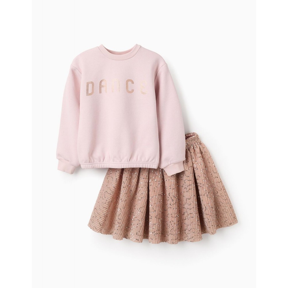 Completo due pezzi per bambine. È composto da una felpa rosa con stampa frontale, polsini a coste e orlo elastico per una vestibilità perfetta. Include anche una gonna plissettata rosa oro con paillettes. Vita elastica e comoda. Fodera in raso. Un completo lucido, da indossare insieme o separatamente.