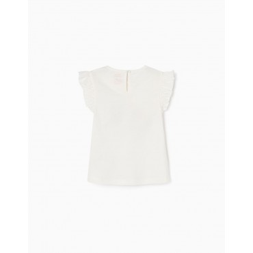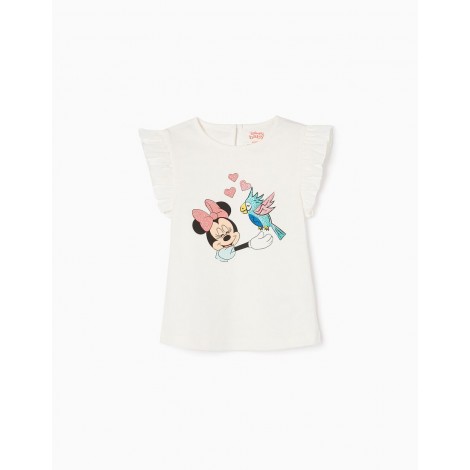 T-shirt bianca smanicata per neonata, 100% cotone. Stampa frontale di Minnie con glitter. Balze sulle spalle. Bottone nella parte posteriore per vestirsi facilmente. Etichetta interna stampata per non irritare la pelle. Una t-shirt leggera, comoda e adorabile, perfetta per l'estate.