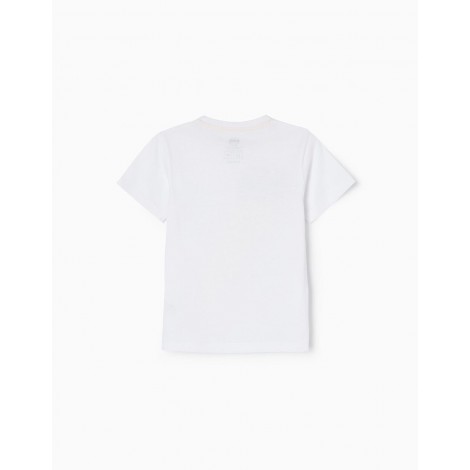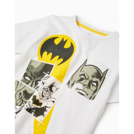 T-shirt bianca a maniche corte per bambino, 100% cotone. Stampa frontale di Batman con dettagli in rilievo. Tasca sul petto. Base asimmetrica, leggermente più lunga nella parte posteriore per un look più fluido. Collo a costine per vestirsi facilmente ed etichetta interna stampata, per non irritare la pelle. La t-shirt perfetta per i ragazzi fan dei supereroi.