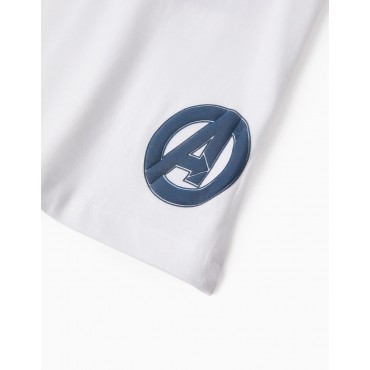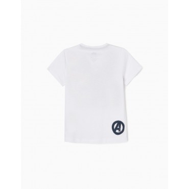 T-shirt bianca Marvel a manica corta per bambino, 100% cotone. Stampa frontale con i personaggi Hulk, Thor, Iron Man e Wrecker. Il simbolo degli Avengers è impresso sul retro. Collo a costine per vestirsi facilmente ed etichetta interna stampata per non irritare la pelle. La t-shirt perfetta per i bambini fan degli Avengers.