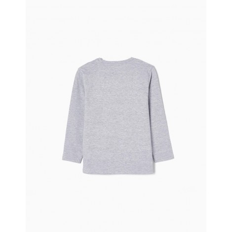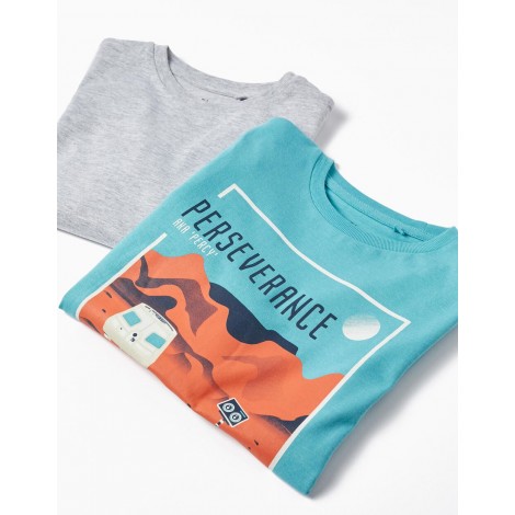 Confezione da due t-shirt in cotone a manica lunga per bambino. Include una t-shirt blu con stampa frontale e una a tinta unita grigia. Etichette stampate all'interno per non irritare la pelle.