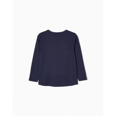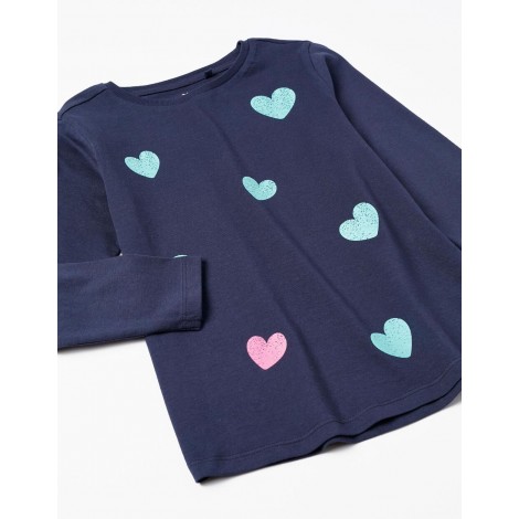 Confezione da due t-shirt manica lunga per bambina, 100% cotone. Include una t-shirt blu scuro con cuori stampati e una bianca con stampa colorata della Porta di Brandeburgo, a Berlino. Etichette stampate all'interno per non irritare la pelle.