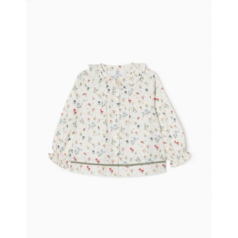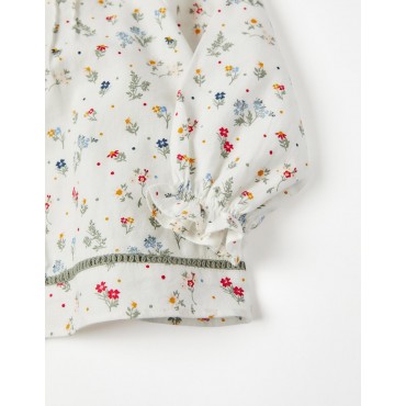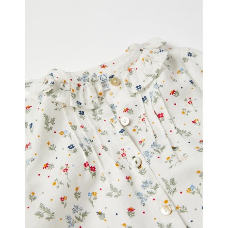 Maglia bianca a fiori per neonata, 100% cotone. Ruches sul collo e sui polsini. Pieghe sul petto e dettaglio crochet a contrasto sul fondo. Chiusura con bottoni sul davanti. Taglio svasato. Una blusa comoda e versatile con un motivo floreale colorato che le ragazze adoreranno