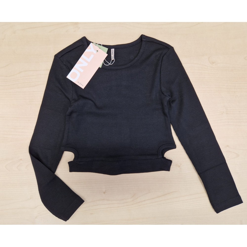 Maglia bambina/ragazza Only nera modello corto, tessuto elasticizzato a costine, dettaglio buchi laterali