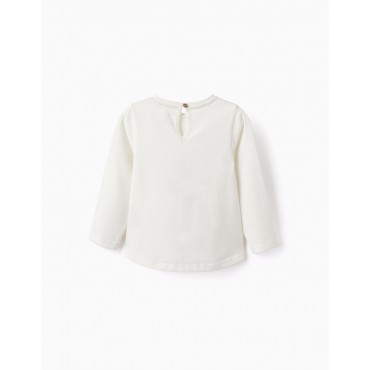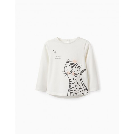 T-shirt bianca a maniche lunghe per neonata, realizzata in jersey 100% cotone per un maggiore comfort. Bella stampa di un gattino sul davanti. Chiusura con bottoni sul retro per vestirsi facilmente. Etichetta interna stampata per non irritare la pelle sensibile del bambino. Un capo che garantisce comfort e accoglienza. Un capo della collezione Mix & Match, che permette infinite combinazioni di pezzi e look.
