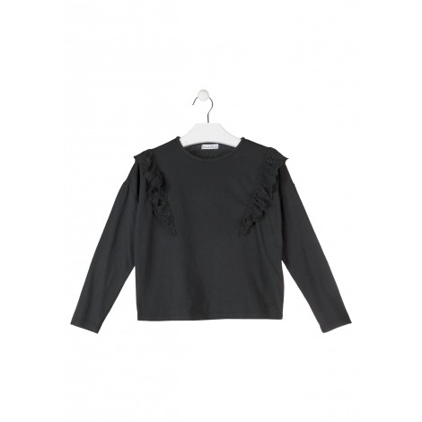 Maglia bambina Losan nera con rouge in san gallo, 100 % cotone, taglio corto e largo
