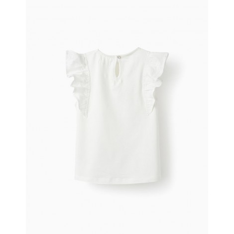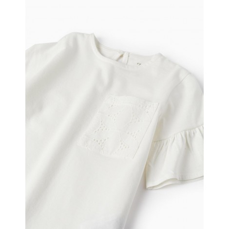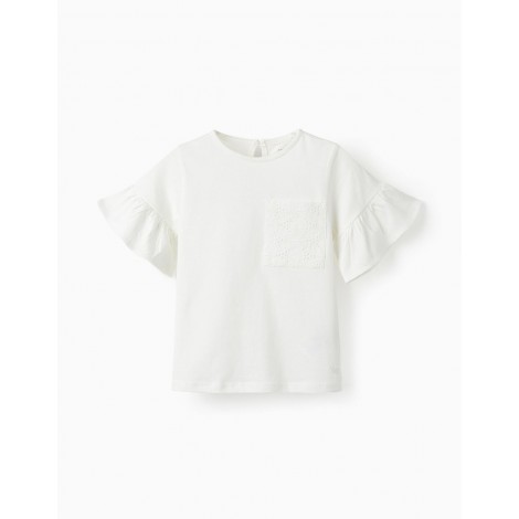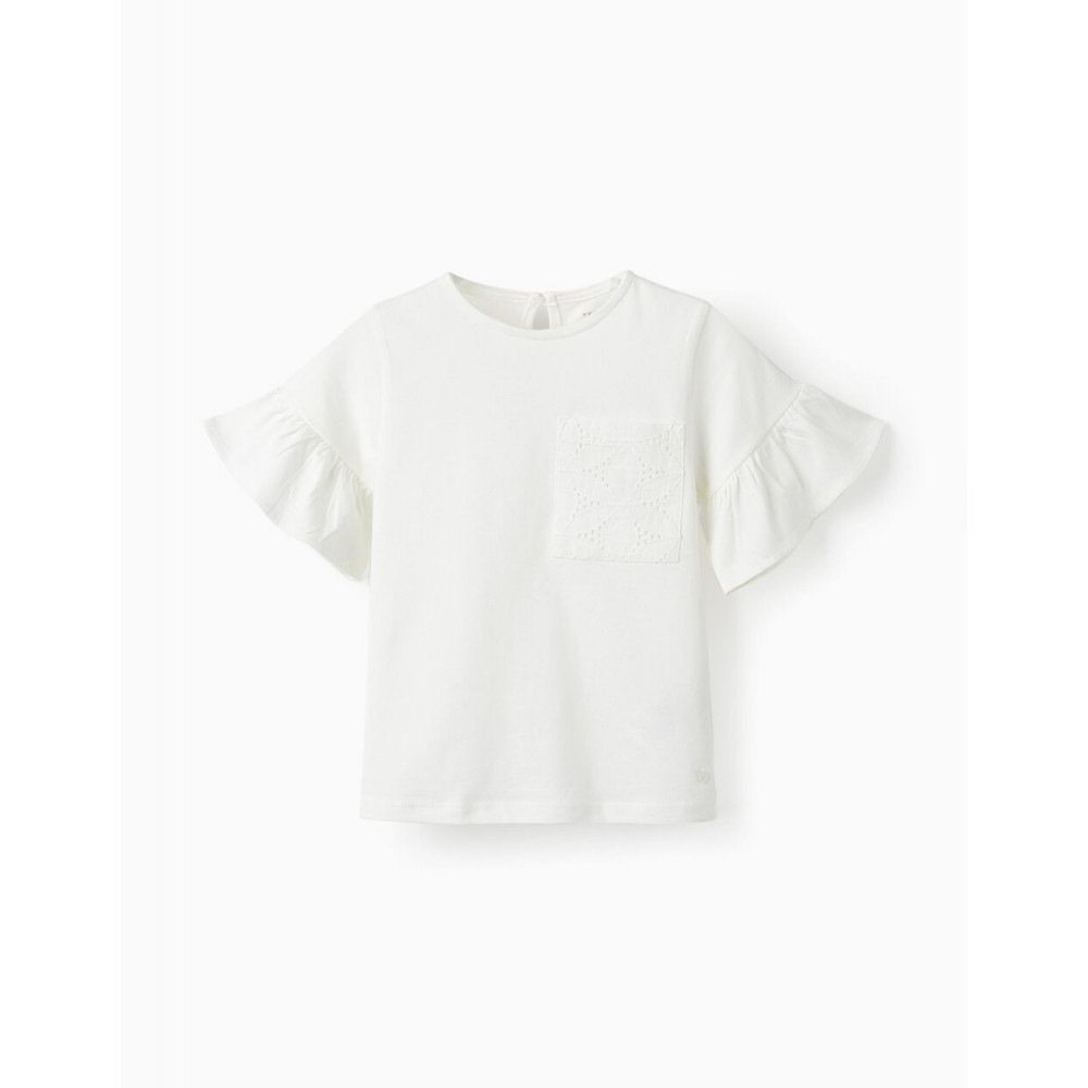 T-shirt bianca a maniche corte per bambina, 100% cotone. Tasca frontale con dettagli ricamati. Volant sulle maniche per un tocco più delicato. Si chiude dietro con un bottone per indossarlo facilmente.