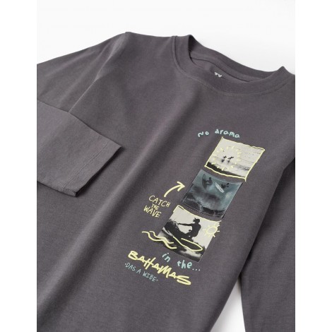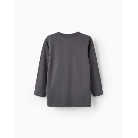 T-shirt grigia a maniche lunghe per bambino, 100% cotone. Stampa laterale con dettaglio olografico. Un'opzione leggera, comoda e pratica da indossare tutti i giorni.