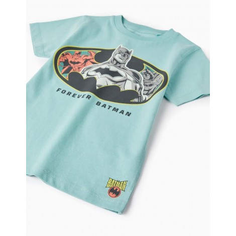 T-shirt verde acqua a maniche corte per bambino, realizzata al 100% in cotone. Stampa Batman frontale. Collo leggermente a costine ed etichetta interna stampata per un maggiore comfort. Una maglietta semplice e comoda, perfetta da indossare tutti i giorni in compagnia di Batman!