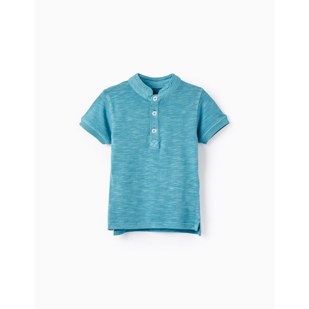 T-shirt blu a maniche corte stile polo per neonato, realizzata in materiale 100% cotone. Base leggermente asimmetrica, leggermente più lunga dietro. Etichetta interna stampata per evitare irritazioni alla pelle. Tinto in capo. Un'opzione perfetta da indossare ogni giorno.